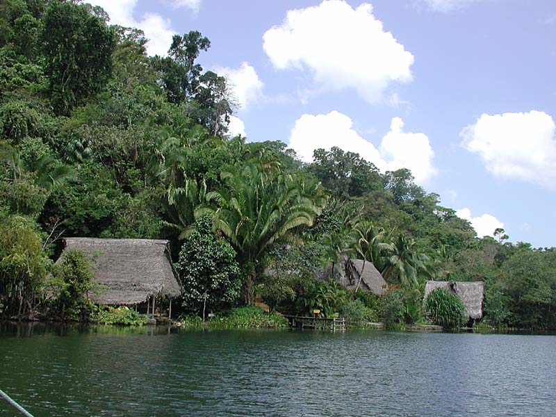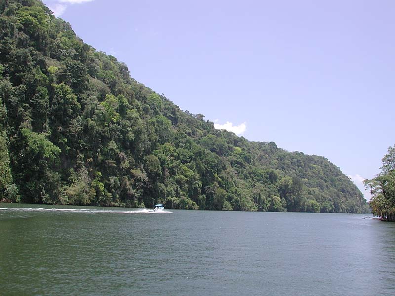 The Rio Dulce river flows through spectacular deep gorges with tropical vegetation and vines clinging to sheer cliff faces before reaching the Bay of Amatique on the Caribbean Coast of Guatemala. Along the banks are a strange mix of the luxurious homes of wealthy Guatemalans and the simple huts of the local families who by night fish the river that is their only link with the outside world. Civilisation seems a long way away...